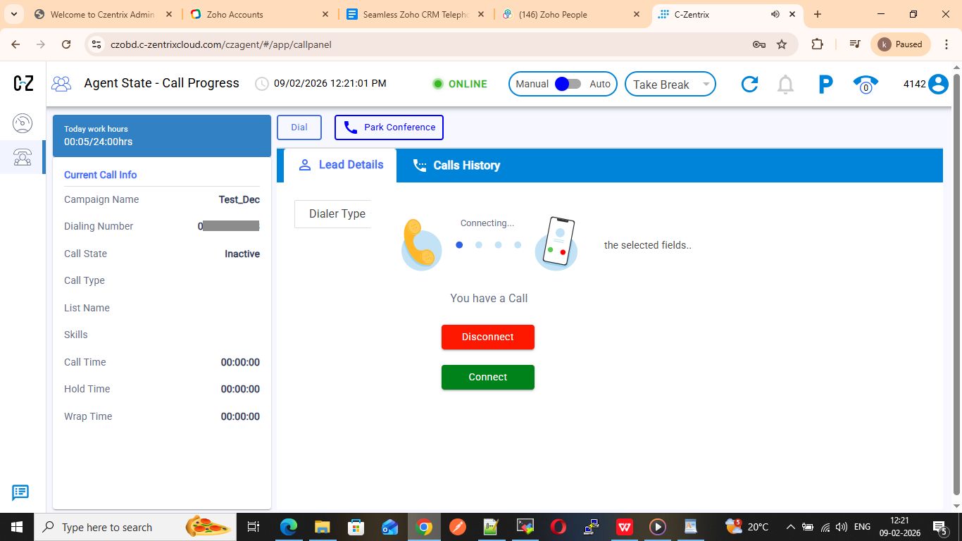 ⚠️If telephony is disabled for a campaign, Zoho will display the message “PhoneBridge is not enabled in Zoho.” This must be resolved before proceeding.